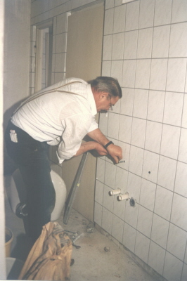 Gottfried Schlögl beim Anschließen des Waschbeckens im Herren - WC